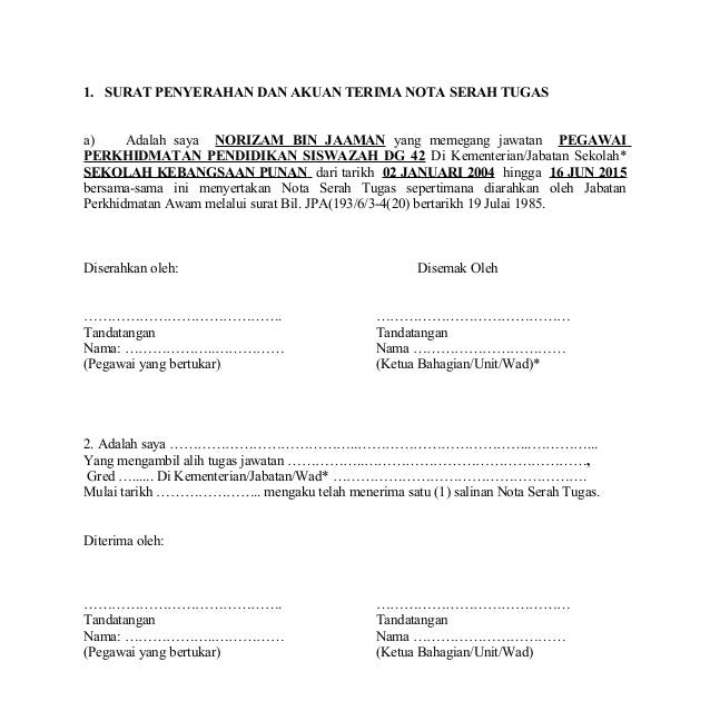 Serahan surat serah tugas / surat serahan tugas Surat serahan tugas nota serah tugas.borang kutipan dan serahan guru ke pejabat darjah. Surat perintah tugas atau surat tugas adalah surat yang secara resmi dikeluarkan oleh perusahaan, instansi, atau organisasi yang ditujukan kepada karyawan untuk melakukan sebuah pekerjaan atau. Contoh surat serah tugas penolong kanan pentadbiran surat masih dianggap media paling efektif surat serah tugas borang kutipan dan serahan guru ke pejabat darjah. Surat serahan tugas 19 contoh surat kuasa pengalihan.